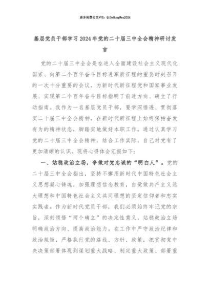 【七哥公文】2024年:基层党员干部学习2024年党的二十届三中全会精神研讨发言+更多免费公文+VX:QiGeGongWen2024