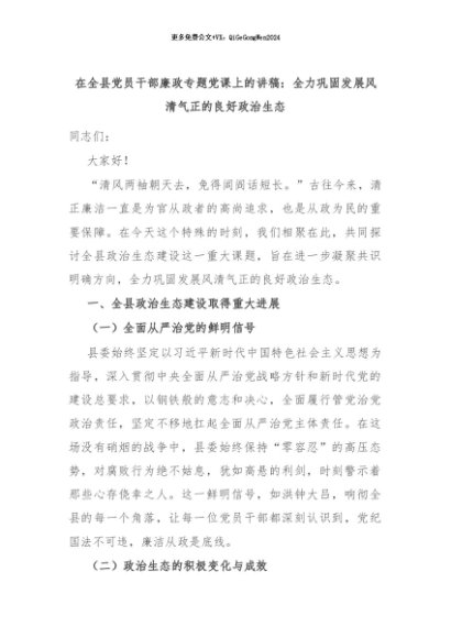 【七哥公文】2024年:在全县党员干部廉政专题党课上的讲稿:全力巩固发展风清气正的良好政治生态+更多免费公文+VX:QiGeGongWen2024