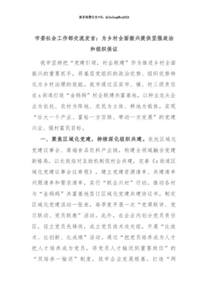 【七哥公文】2024年:市委社会工作部交流发言:为乡村全面振兴提供坚强政治和组织保证+更多免费公文+VX:QiGeGongWen2024
