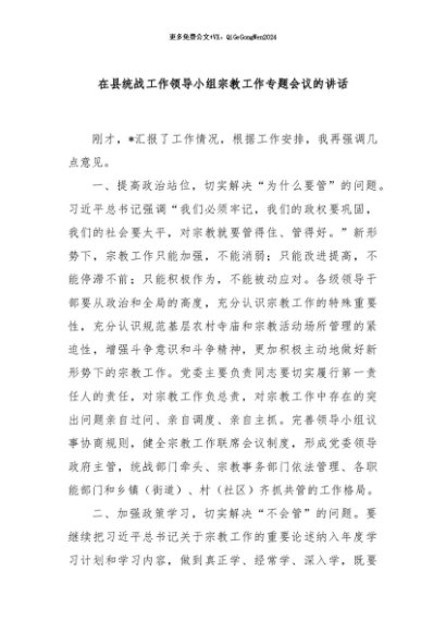 / 【七哥公文】2024年:在县统战工作领导小组宗教工作专题会议的讲话+更多免费公文+VX:QiGeGongWen2024