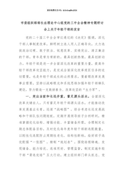【七哥公文】2024年:市委组织部部长在理论中心组党的三中全会精神专题研讨会上关于年轻干部的发言+更多免费公文+VX:QiGeGongWen2024