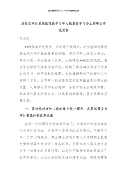 【七哥公文】2024年:局长在审计局党组理论学习中心组集体学习会上的研讨交流发言+更多免费公文+VX:QiGeGongWen2024