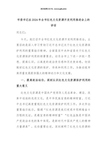 【七哥公文】2024年:市委书记在2024年全市红色文化资源开发利用推进会上的讲话+更多免费公文+VX:QiGeGongWen2024