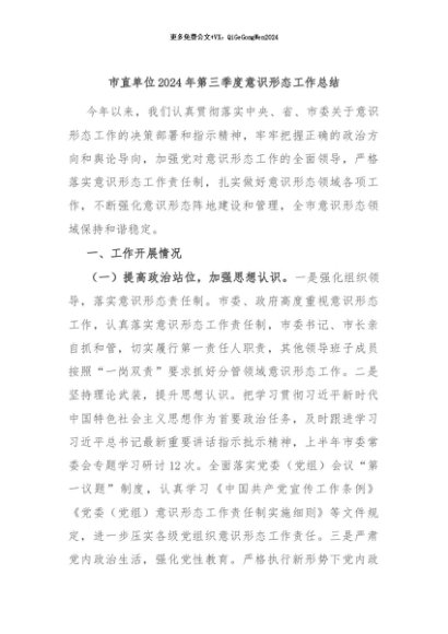 / 【七哥公文】2024年:市直单位2024年第三季度意识形态工作总结+更多免费公文+VX:QiGeGongWen2024