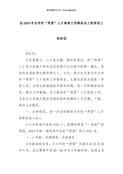 【七哥公文】2024年:在2024年全市村“两委”人才培养工作推进会上的讲话上的讲话+更多免费公文+VX:QiGeGongWen2024