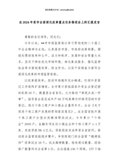 【七哥公文】2024年:在2024年某市全面深化改革重点任务推进会上的汇报发言+更多免费公文+VX:QiGeGongWen2024