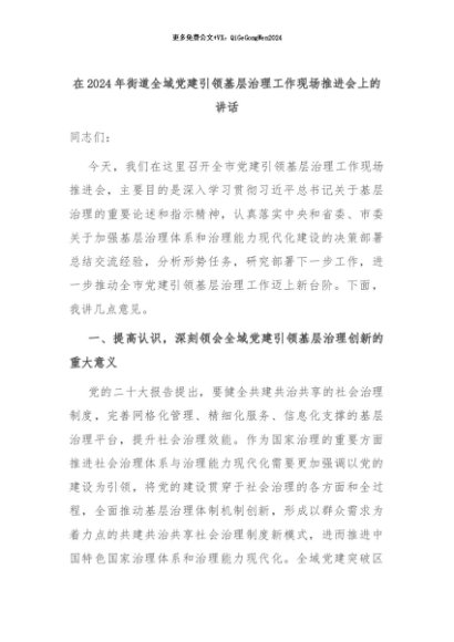 【七哥公文】2024年:在2024年街道全域党建引领基层治理工作现场推进会上的讲话+更多免费公文+VX:QiGeGongWen2024