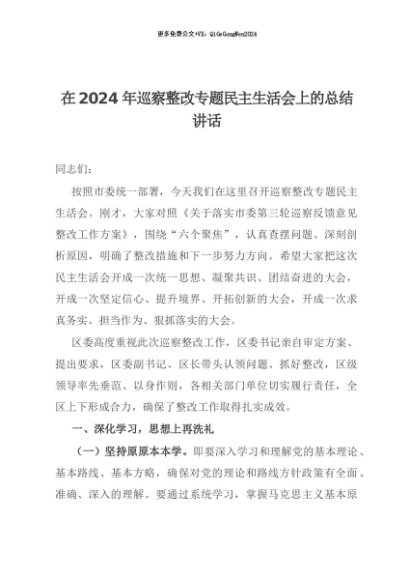 / 【七哥公文】2024年:在2024年巡察整改专题民主生活会上的总结讲话+更多免费公文+VX:QiGeGongWen2024