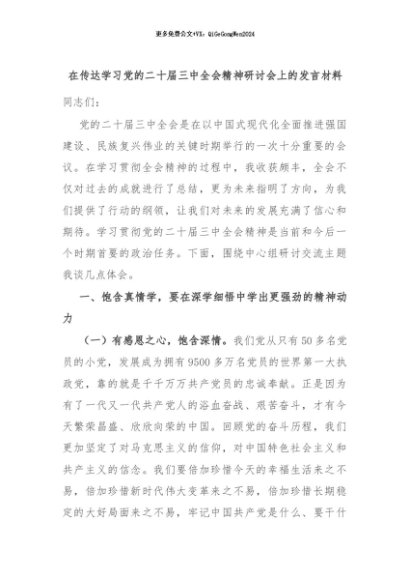 【七哥公文】2024年:在传达学习党的二十届三中全会精神研讨会上的发言材料+更多免费公文+VX:QiGeGongWen2024