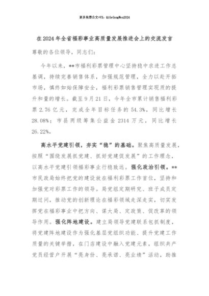 【七哥公文】2024年:在2024年全省福彩事业高质量发展推进会上的交流发言+更多免费公文+VX:QiGeGongWen2024