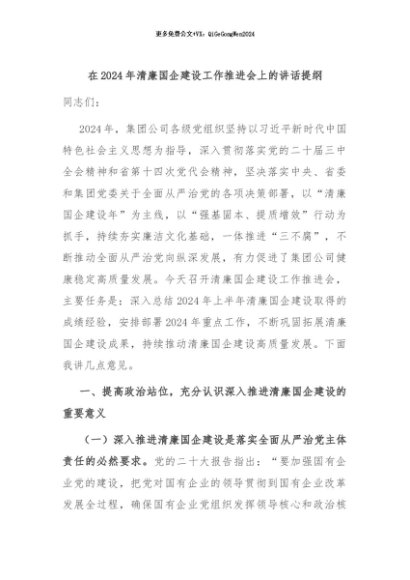 / 【七哥公文】2024年:在2024年清廉国企建设工作推进会上的讲话提纲+更多免费公文+VX:QiGeGongWen2024