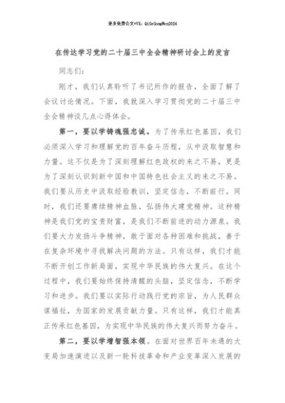 / 【七哥公文】2024年:在传达学习党的二十届三中全会精神研讨会上的发言+更多免费公文+VX:QiGeGongWen2024