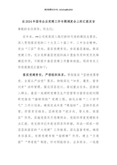 【七哥公文】2024年:在2024年国有企业党建工作专题调度会上的汇报发言+更多免费公文+VX:QiGeGongWen2024