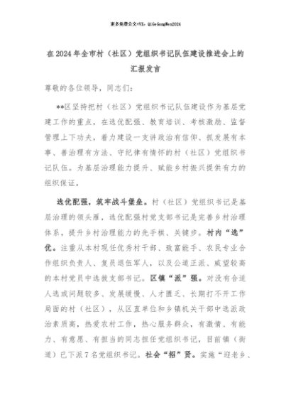 【七哥公文】2024年:在2024年全市村(社区)党组织书记队伍建设推进会上的汇报发言+更多免费公文+VX:QiGeGongWen2024