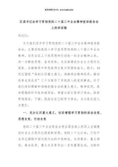 【七哥公文】2024年:区委书记在学习贯彻党的二十届三中全会精神宣讲报告会上的讲话稿+更多免费公文+VX:QiGeGongWen2024