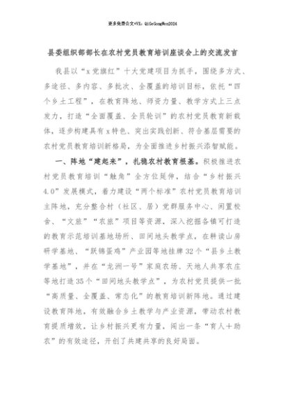 【七哥公文】2024年:县委组织部部长在农村党员教育培训座谈会上的交流发言+更多免费公文+VX:QiGeGongWen2024
