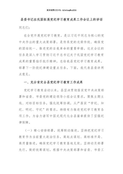 【七哥公文】2024年:县委书记在巩固拓展党纪学习教育成果工作会议上的讲话+更多免费公文+VX:QiGeGongWen2024