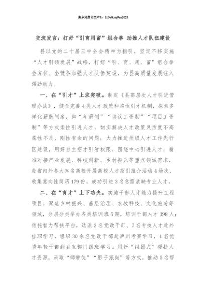 【七哥公文】2024年:交流发言:打好“引育用留”组合拳 助推人才队伍建设+更多免费公文+VX:QiGeGongWen2024