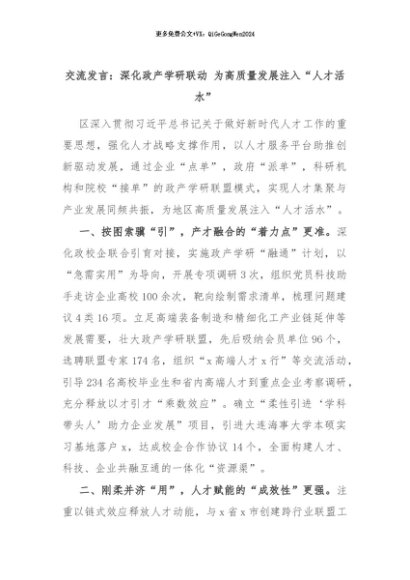 【七哥公文】2024年:交流发言:深化政产学研联动 为高质量发展注入“人才活水”+更多免费公文+VX:QiGeGongWen2024