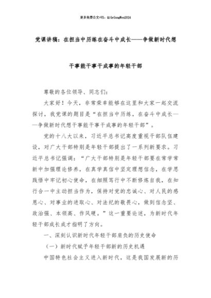 【七哥公文】2024年:党课讲稿:在担当中历练在奋斗中成长——争做新时代想干事能干事干成事的年轻干部+更多免费公文+VX:QiGeGongWen2024