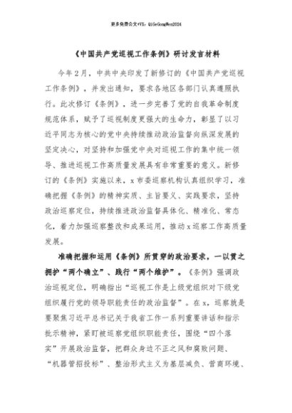 / 【七哥公文】2024年:《中国共产党巡视工作条例》研讨发言材料+更多免费公文+VX:QiGeGongWen2024