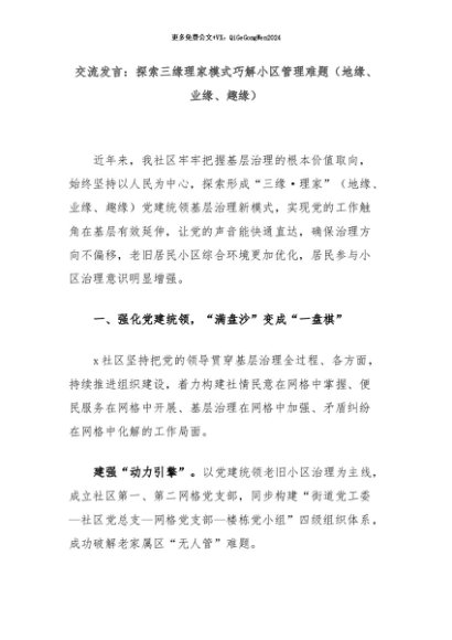 【七哥公文】2024年:交流发言:探索三缘理家模式巧解小区管理难题(地缘、业缘、趣缘)+更多免费公文+VX:QiGeGongWen2024