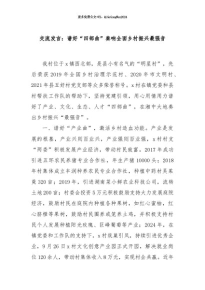 / 【七哥公文】2024年:交流发言:谱好“四部曲”奏响全面乡村振兴最强音+更多免费公文+VX:QiGeGongWen2024