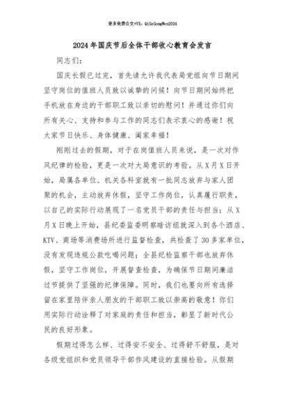 / 【七哥公文】2024年:2024年国庆节后全体干部收心教育会发言+更多免费公文+VX:QiGeGongWen2024