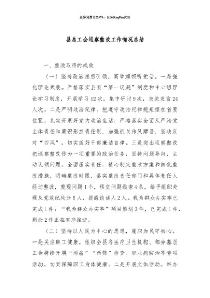 / 【七哥公文】2024年:县总工会巡察整改工作情况总结+更多免费公文+VX:QiGeGongWen2024