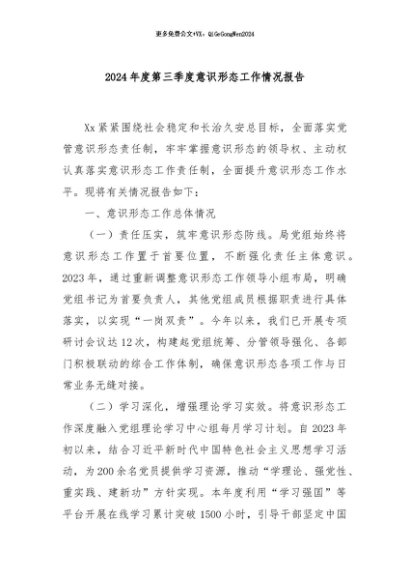 / 【七哥公文】2024年:2024年度第三季度意识形态工作情况报告+更多免费公文+VX:QiGeGongWen2024