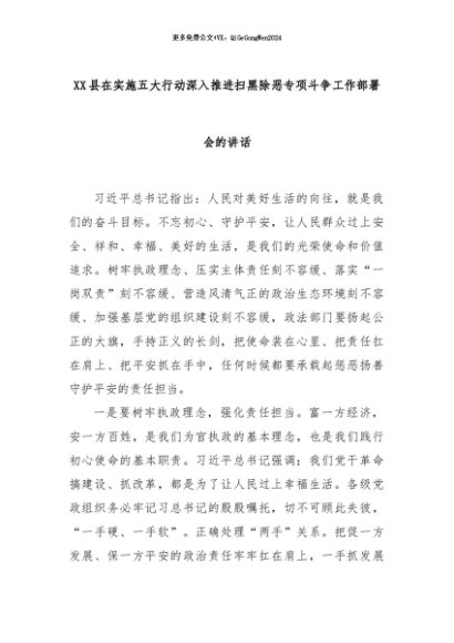 【七哥公文】2024年:XX县在实施五大行动深入推进扫黑除恶专项斗争工作部署会的讲话+更多免费公文+VX:QiGeGongWen2024