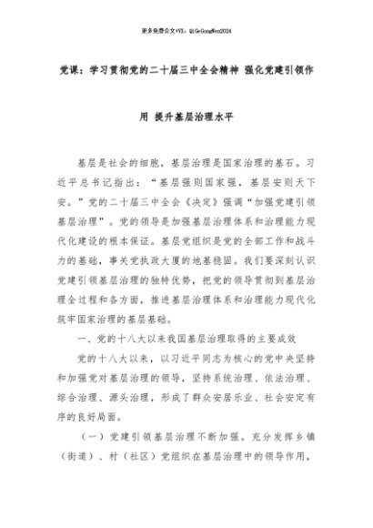 【七哥公文】2024年:党课:学习贯彻党的二十届三中全会精神 强化党建引领作用 提升基层治理水平+更多免费公文+VX:QiGeGongWen2024