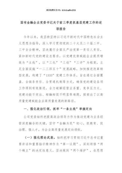 【七哥公文】2024年:国有金融企业党委书记关于前三季度抓基层党建工作的述职报告+更多免费公文+VX:QiGeGongWen2024