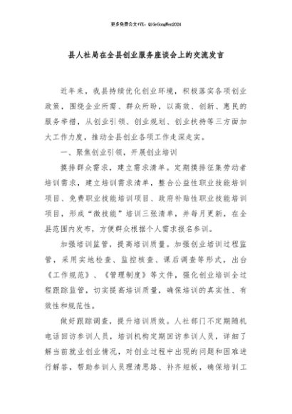 / 【七哥公文】2024年:县人社局在全县创业服务座谈会上的交流发言+更多免费公文+VX:QiGeGongWen2024