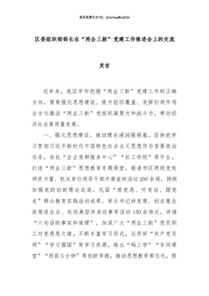 【七哥公文】2024年:区委组织部部长在“两企三新”党建工作推进会上的交流发言+更多免费公文+VX:QiGeGongWen2024