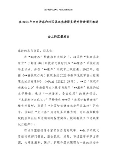【七哥公文】2024年:在2024年全市居家和社区基本养老服务提升行动项目推进会上的汇报发言+更多免费公文+VX:QiGeGongWen2024