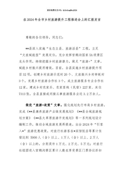 【七哥公文】2024年:在2024年全市乡村旅游提升工程推进会上的汇报发言+更多免费公文+VX:QiGeGongWen2024