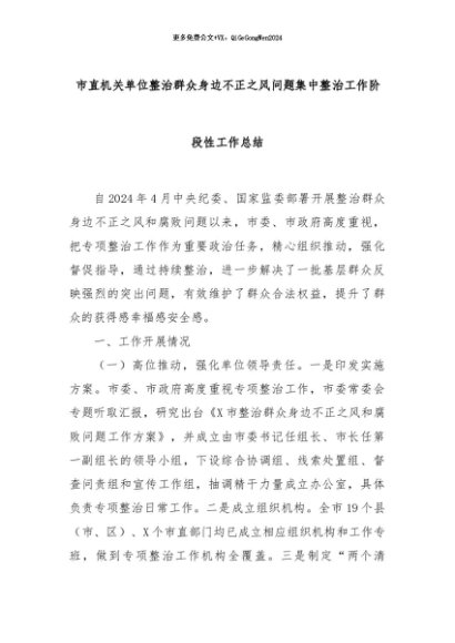 【七哥公文】2024年:市直机关单位整治群众身边不正之风问题集中整治工作阶段性工作总结+更多免费公文+VX:QiGeGongWen2024