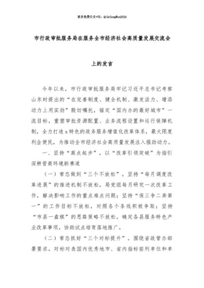 【七哥公文】2024年:市行政审批服务局在服务全市经济社会高质量发展交流会上的发言+更多免费公文+VX:QiGeGongWen2024