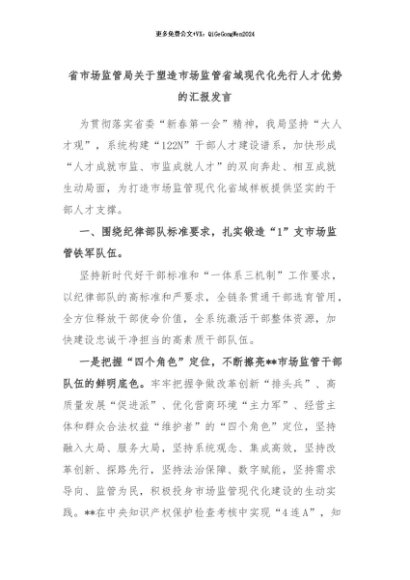 【七哥公文】2024年:省市场监管局关于塑造市场监管省域现代化先行人才优势的汇报发言+更多免费公文+VX:QiGeGongWen2024