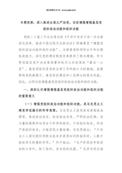 【七哥公文】2024年:专题党课:深入推进全面从严治党,切实增强增强基层党组织政治功能和组织功能+更多免费公文+VX:QiGeGongWen2024