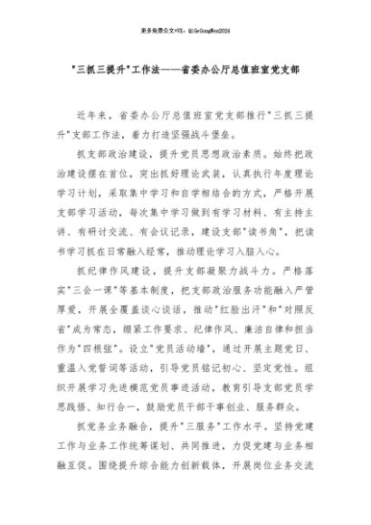 / 【七哥公文】2024年:“三抓三提升”工作法——省委办公厅总值班室党支部+更多免费公文+VX:QiGeGongWen2024