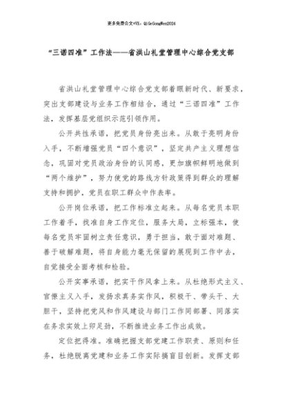 【七哥公文】2024年:“三诺四准”工作法——省洪山礼堂管理中心综合党支部+更多免费公文+VX:QiGeGongWen2024
