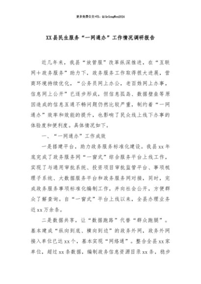 / 【七哥公文】2024年:XX县民生服务“一网通办”工作情况调研报告+更多免费公文+VX:QiGeGongWen2024