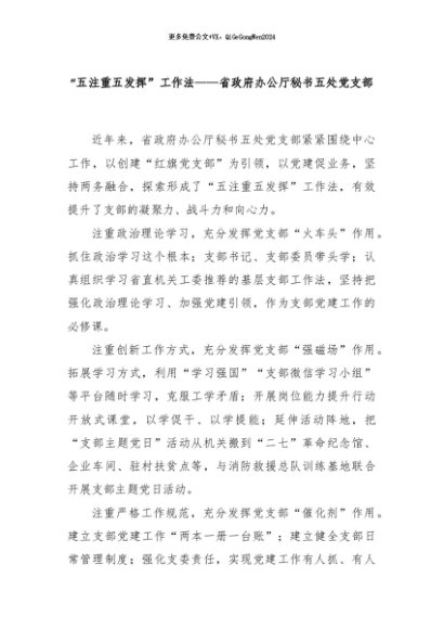 【七哥公文】2024年:“五注重五发挥”工作法——省政府办公厅秘书五处党支部+更多免费公文+VX:QiGeGongWen2024