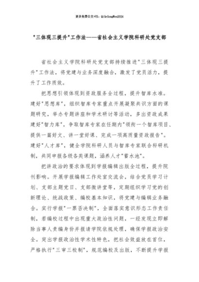 【七哥公文】2024年:“三体现三提升”工作法——省社会主义学院科研处党支部+更多免费公文+VX:QiGeGongWen2024