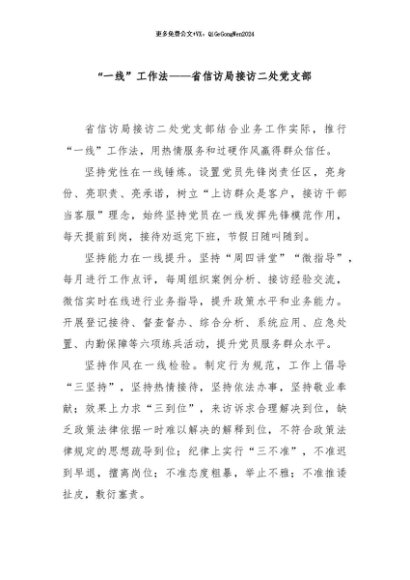 / 【七哥公文】2024年:“一线”工作法——省信访局接访二处党支部+更多免费公文+VX:QiGeGongWen2024