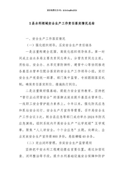 / 【七哥公文】2024年:X县水利领域安全生产工作责任落实情况总结+更多免费公文+VX:QiGeGongWen2024