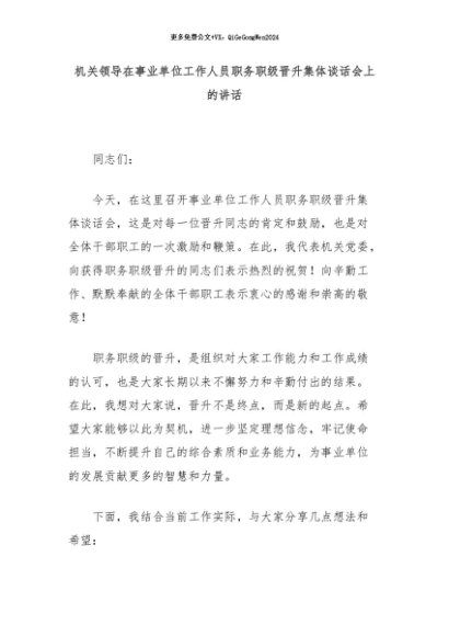 【七哥公文】2024年:机关领导在事业单位工作人员职务职级晋升集体谈话会上的讲话+更多免费公文+VX:QiGeGongWen2024