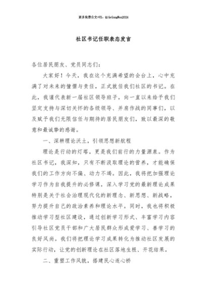 【七哥公文】2024年:社区书记任职表态发言+更多免费公文+VX:QiGeGongWen2024
